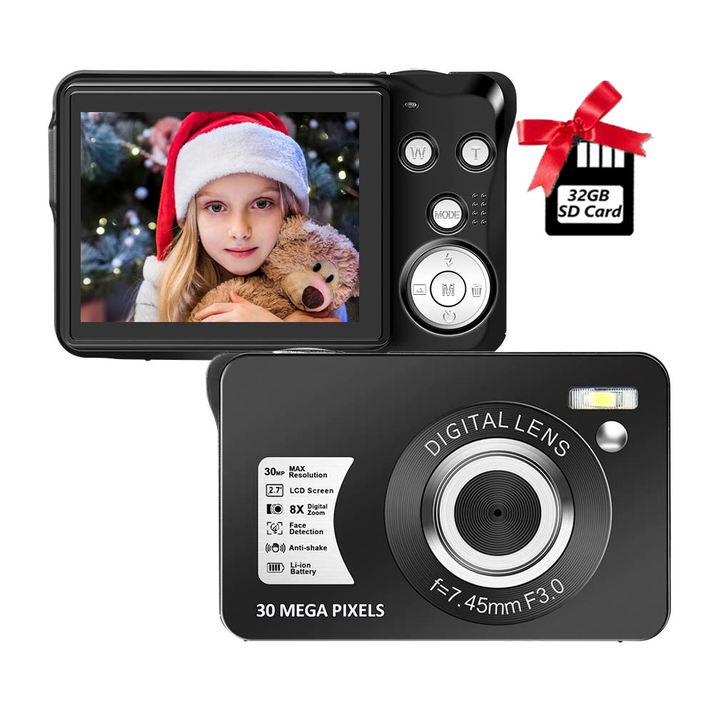 - Digital Camera,30MP Compact Camera,2.7 inch Pocket Camera,Rechargeable Small Digital Camera for Kids,Students,School,Children,Photography with 8X Zoom 32GB SD Card Included Black costs $47.98