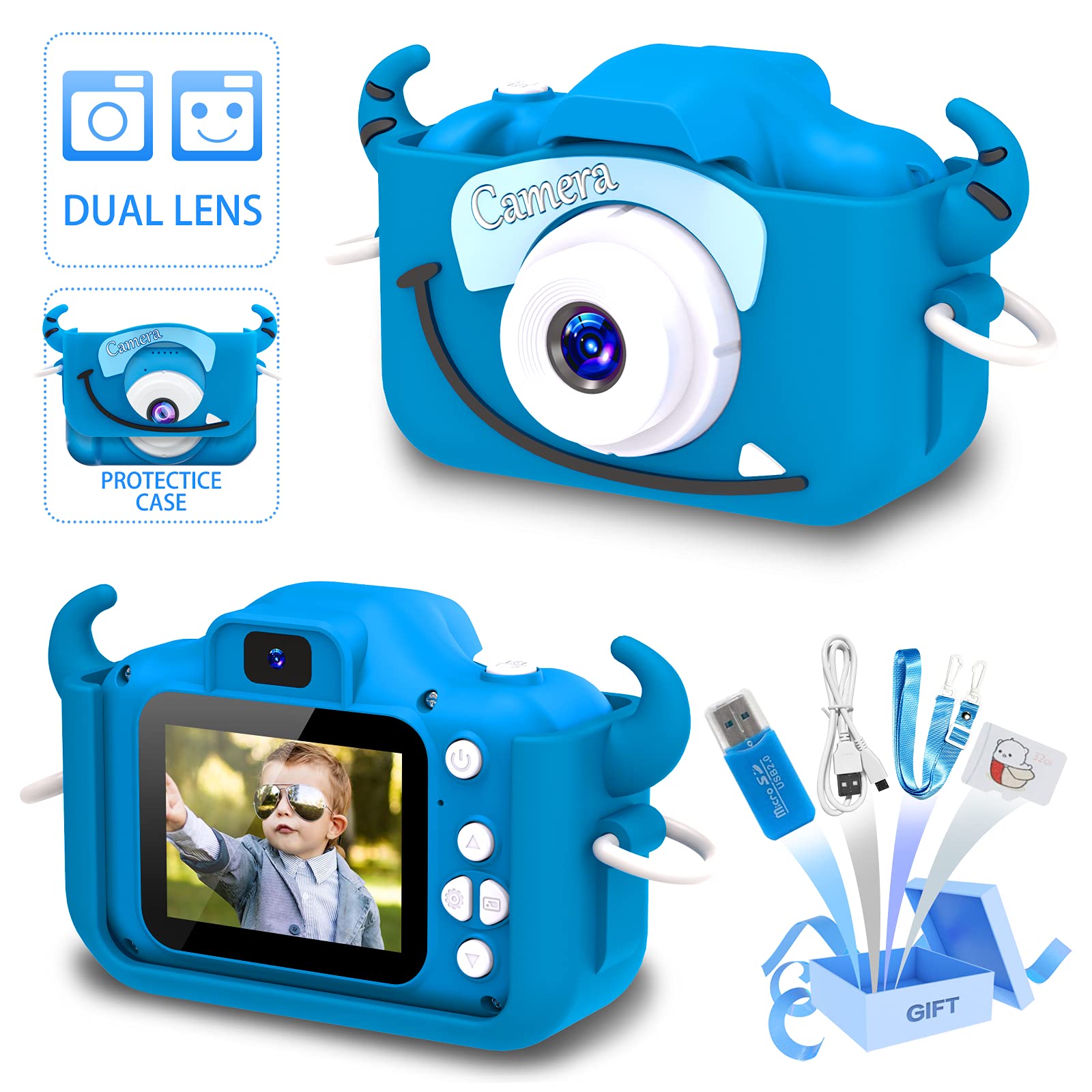 - Goopow Kids Camera Toys for 3-8 Years Old Boys and Girl, Kids Digital Video Camera for Children with Shockproof Soft Cover, Best Christmas Birthday Gifts for Boys Girls - 32GB SD Card Included (Blue) costs $25.99