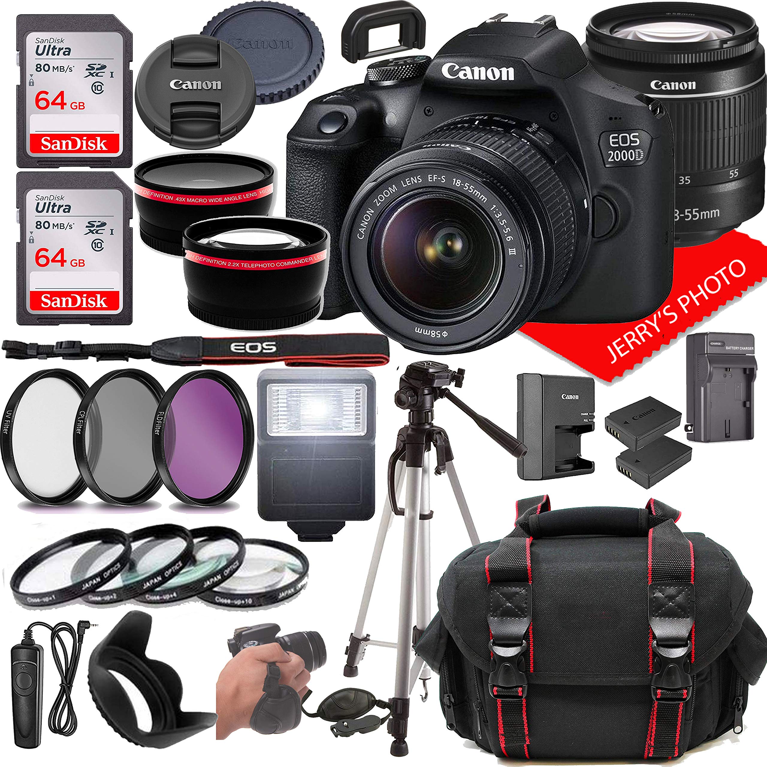 - This Jerry’s Photo DSLR Camera Package Includes 2 X Sandisk 64GB Class 10 SD Memory Cards ,USB Card Reader ,58mm 3 Piece Filter Kit , 58mm 4 Piece Macro Kit ,58mm .43 Wide Angle Lens, 58mm 2.2x Telephoto Lens, 58mm Tulip Hood 50 inch DSLR Tripod, Battery Charger ,Spare High Capacity Battery , Spare travel Charger ,Wired Remote Shutter, Slave Flash, Lens Caps , And Body Cap ,Neck Strap , Jerry’s Photo Lens Cleaning Cloth ,Camera Gadget Bag + 1 Year Seller Supplied Warranty , And Includes :