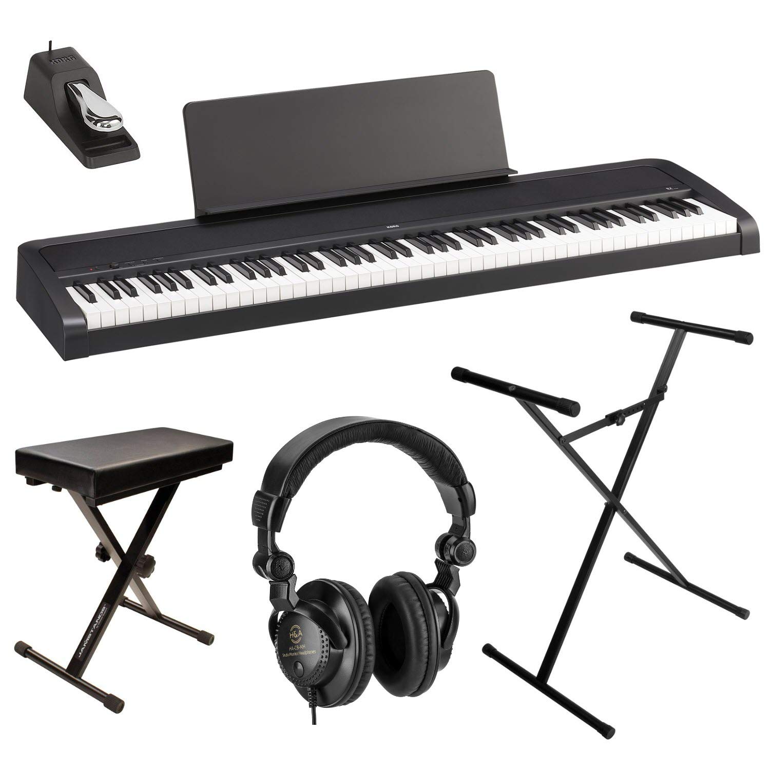 - KIT INCLUDES: Korg B2 88-Key Digital Piano | AC Adapter | Music Rest | Damper Pedal | Keyboard Stand | Keyboard Bench | H&A Studio Monitor Headphones
