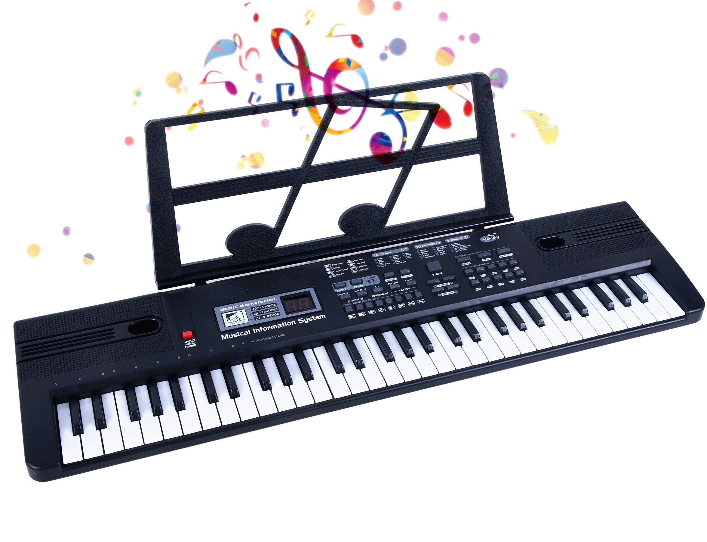 - 61 KEYS Digital Piano MULTIPLE FUNCTIONS: Piano keyboard USB power supply and battery supply / English instruction / Microphone / USB DC cable / 16 kinds of timbre / 8 kinds of percussion instrument recording / 10 kinds of rhythm / 6 demos / 61 black and white keys/ Piano mat comes with Record, Playback, Demo, Play, Adjustable Vol.b.